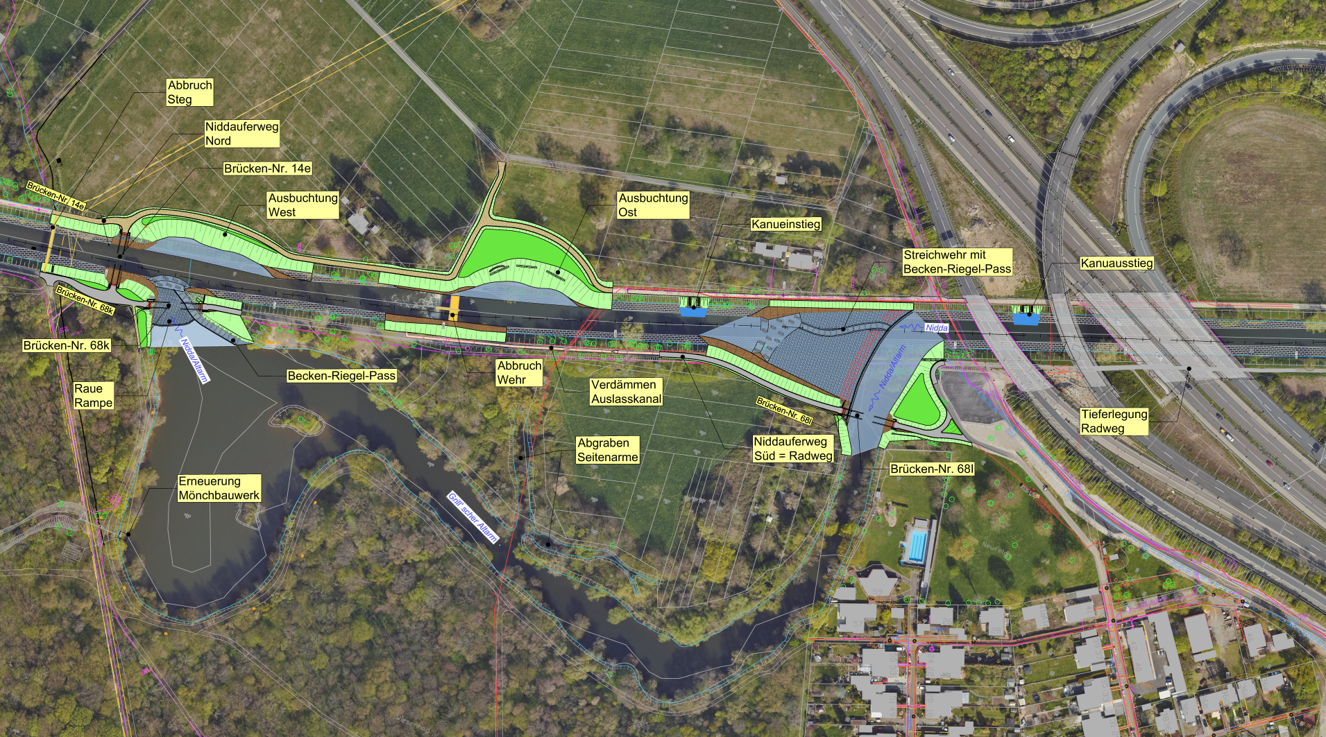 - Die Uferwege werden nach der Baumaßnahme wiederhergestellt. Der südliche Niddauferweg erhält einen hellen Asphalt analog zu den Wegen am Höchster Wehr. Der nördliche Uferweg wird mit einer wassergebundenen Deckschicht ausgeführt.